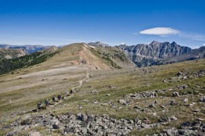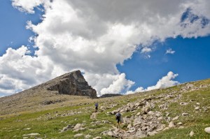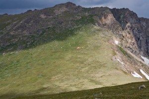we could see where we needed to go, but there was a 1,000 ft shear cliff between us and our next camp. after scouring the landscape with six sets of eyes, we finally met back up with our trail. but it took us up another steep incline, to a shale covered hill over 12,000 feet up.