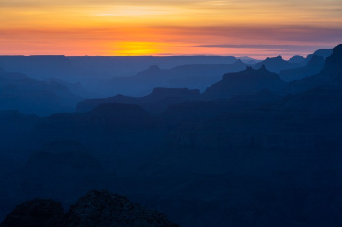 Sometimes a partial silhouette is your best choice for an image. What I mean by “partial” is that instead of having a pure black subject, you might have several layers of tones. But it still constitutes a silhouette because there is no real detail in the shadows to speak of… they are simply shades of color (or gray in B&W). These work wonderfully well when there are layers of mountains in the distance. I use this technique often to convey distance, grandeur, and intense color. Below is a good example from a recent shoot in the Grand Canyon.