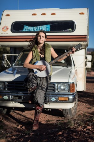 Shanti also carries a banjo.