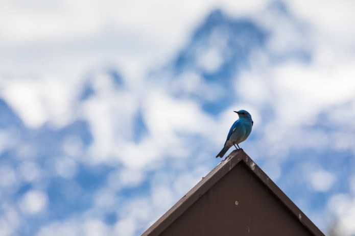 A mountain bluebird perched with the Grand Teton as a background.