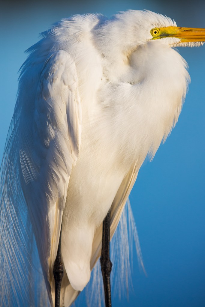 Great blue herons can be surprisingly skittish. I knew I wanted a detail shot if the feathers which would require a closer shot even with a 400mm lens. I found the right location to make this shot through research.