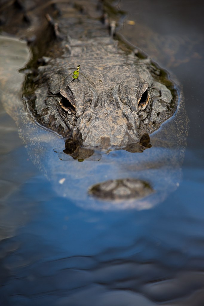 Knowing from research that this was an area in which I could get close access to american alligators from a low angle, I was placed in the right scenario to catch a dragonfly resting on this gators head.